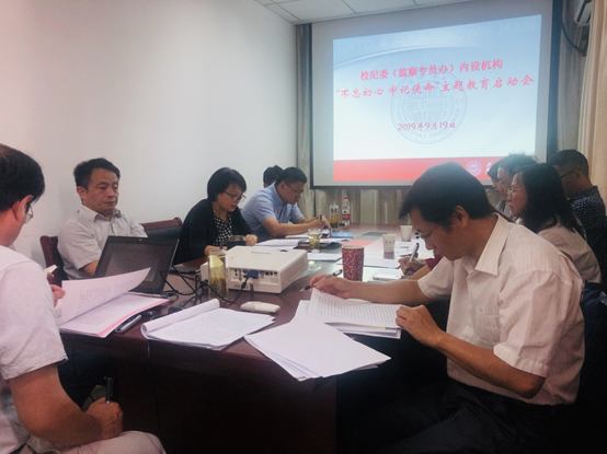 根据中央、省委和学校党委工作部署,2019年9月19日上午,纪检监察党支部在纵横楼149会议室召开了“不忘初心、牢记使命”主题教育启动会。校党委常委、纪委书记、监察专员芮国强出席会议,学校主题教育第二巡回指导组成员列席会议并进行工作指导。会议由校纪委副书记黄志斌主持。