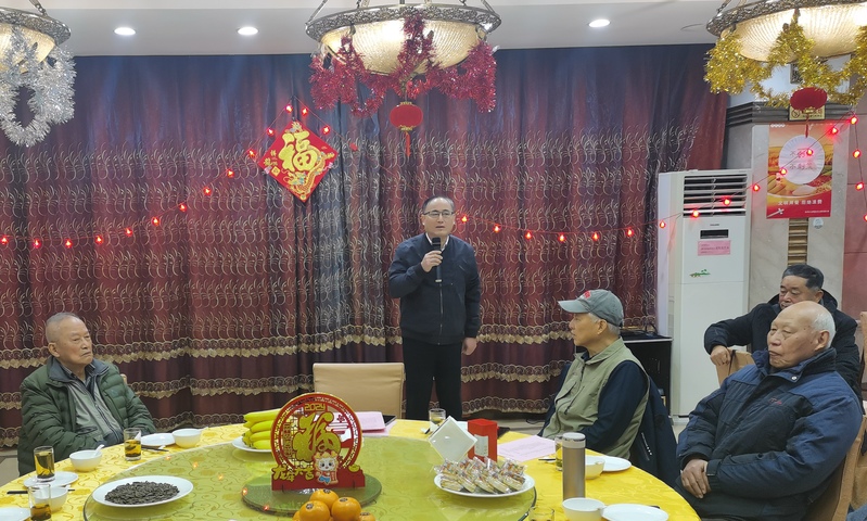 会后,宫向阳向老同志发放新春礼包,大家集体合影留念并用餐。