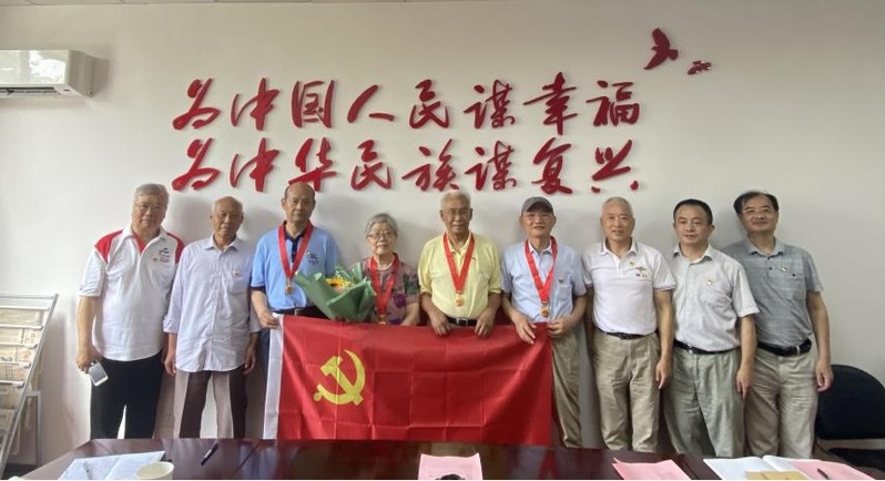芮国强为何水大、冯凤和、沙惠忠、赵子川等老同志代表逐个颁发了“光荣在党50年”纪念章,黄志斌为肖平、何大康、吴东明等老党员代表逐个发放了“七一”慰问金。本次共有9名纪检监察退休老党员荣获了“光荣在党50年”纪念章,6名老党员获得“七一”慰问金。