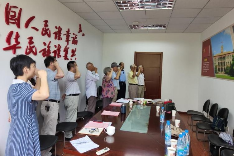 随后,在退休党支部书记肖平的领誓下,老党员与在职党员一起,高举右拳,面向党旗,重温入党誓词。