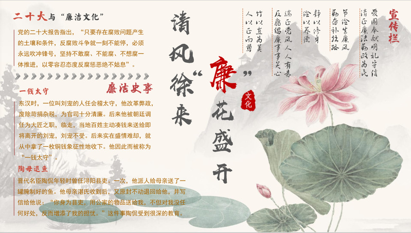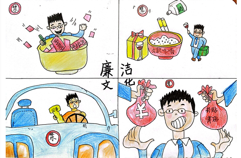 此次活动吸引了广大学生的积极参与,同学们围绕主题,展开想象,用心设计出了一份份图文并茂、色彩缤纷的漫画及手抄报作品。无论是反对公款吃喝、公车私用、收受贿赂的行径,还是讽刺金钱为上、玩火自焚的官员,无论是歌颂出淤泥而不染的莲花,还是褒扬“一钱太守”“陶母退鱼”的廉洁史事,无不诠释着同学们对廉洁的理解,以及对贪腐的痛恨与憎恶。