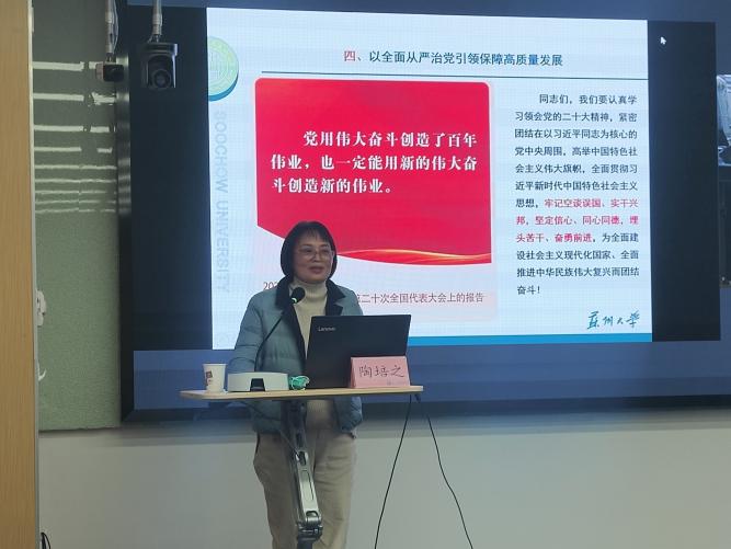 陶培之作题为《学习党的二十大精神——以全面从严治党引领保障高质量发展》的专题辅导报告。她从推进全面从严治党历史脉络、中央八项规定如何开局破题、从严管理干部“组合套拳”如何实施以及坚持大抓基层的鲜明导向,结合《中国共产党纪律检查委员会工作条例》重点章节,专业、系统地阐述了纪检干部学习宣传、贯彻落实党的二十大精神的落脚点、着力点和关键点,对新时代纪检干部履行工作职责、提升业务能力、塑造可亲、可敬、可信的良好形象提出了要求。